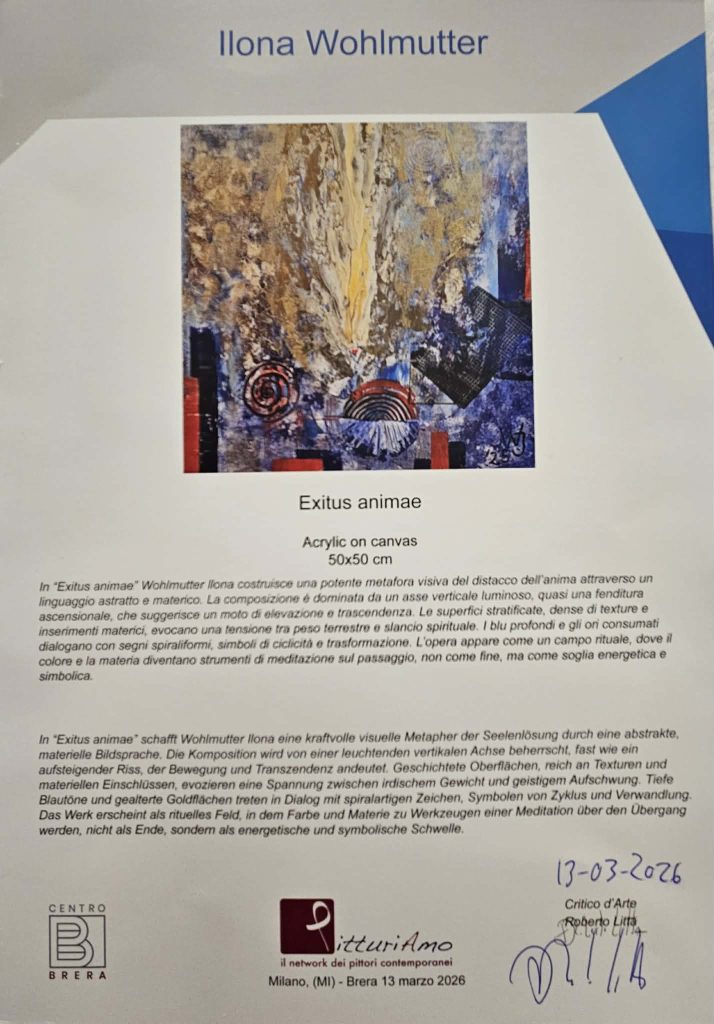 2026 március 13.-án ban részt vettem a milánói Premio Internazionale di Arte Contemporanea – Premio Brera 26 rangos nemzetközi művészeti eseményen, amelyet a Pitturiamo szervezett Milánó művészeti központjában. Az eseményen az „Exitus animae” című festményemmel vettem részt, ahol különdíjat nyertem. A program során lehetőségem volt személyesen bemutatni önmagamat és a művemet a jelen lévő galeristák, művészeti szakemberek és közönség előtt. Különösen értékes élményt jelentett számomra, hogy személyes szakmai értékelést kaptam Roberto Litta műkritikustól, aki részletesen elemezte a festményem gondolati és érzelmi rétegeit. A milánói részvétel fontos állomás volt művészi utamon: lehetőséget adott arra, hogy nemzetközi közegben képviseljem munkámat és párbeszédet folytassak a kortárs művészet szakértőivel.